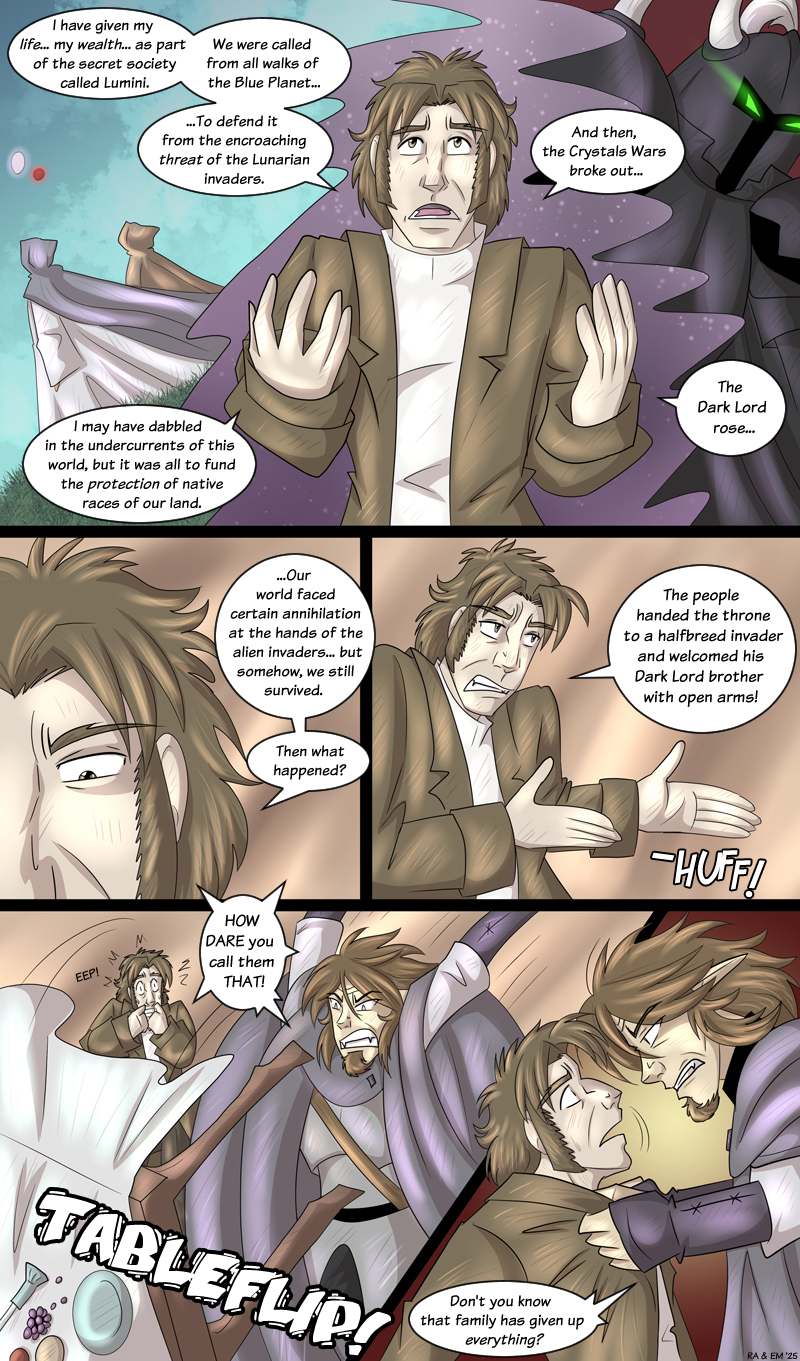 Bradhoc: I have given my life... my wealth... as part of the secret society called Lumini. We were called from all walks of the Blue Planet to defend it from the encroaching threat of the Lunarian invaders. I may have dabbled in the undercurrents of this world, but it was all to fund the protection of native races of our land. And then, the Crystals Wars broke out... the Dark Lord rose... *shakes his head* ...Our world faced certain annihilation at the hands of the alien invaders... but somehow, we still survived. Then what happened? The people handed the throne to a halfbreed invader and welcomed his Dark Lord brother with open arms!