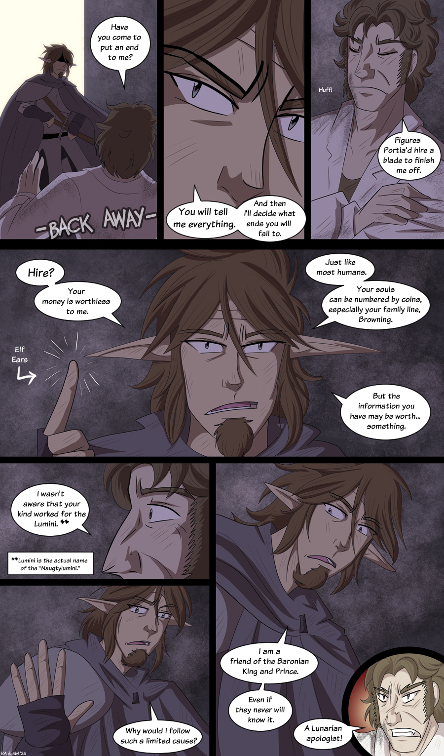 Rye: Hire? *hrmphs* Your money is worthless to me. *points to his elf ears* Just like most humans. Your souls can be numbered by coins, especially your family line, Browning. But the information you have may be worth... something.