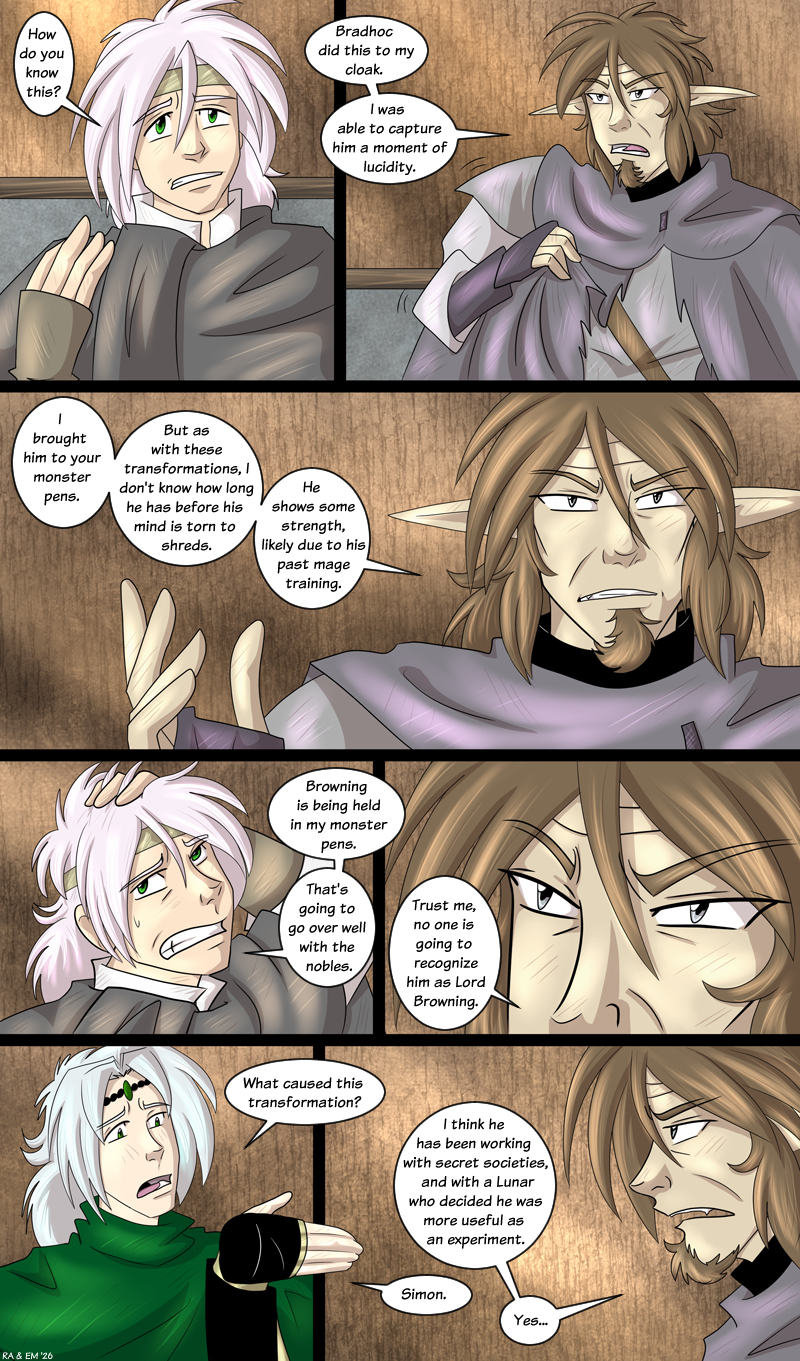 Rye: *shows Cecil his ripped up cloak* Bradhoc did this to my cloak. *frowns* I was able to capture him a moment of lucidity. I brought him to your monster pens. But as with these transformations, I don't know how long he has before his mind is torn to shreds. He shows some strength, likely due to his past mage training.